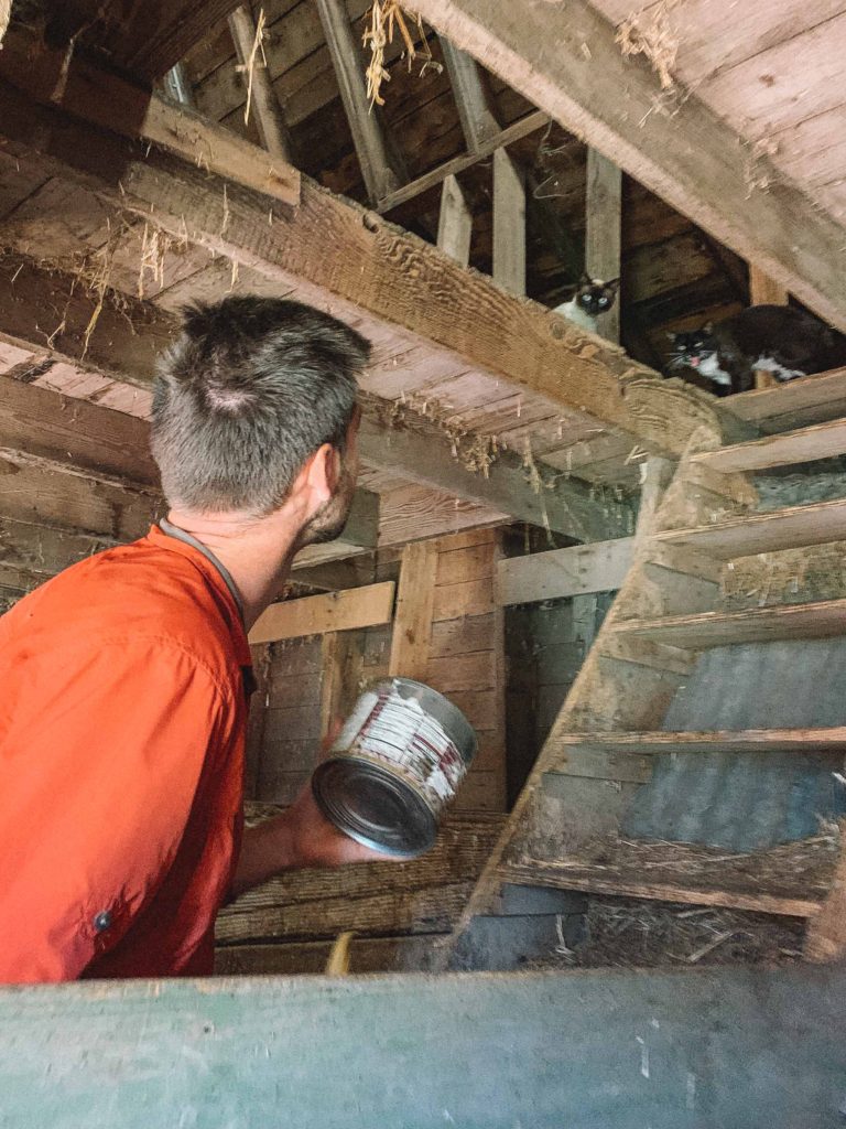 You might think that walking beside two-thousand pound bulls or behind horses would be among the most frightening chores, but it’s actually feeding the barn cats that takes the cake. Dean, menacingly, placed the cat food tray up in the rafters, so Jessie or I have to stick our heads- one of the more important body parts- through the opening in the rafters to pour their food into the tray. Every time we are greeted by a chorus of vocally ungrateful felines. The kittens have learned the ways of their elders in a matter of weeks. Observe.